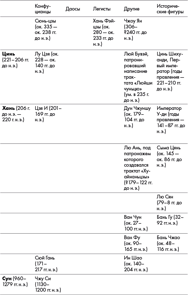 В этой таблице в приблизительном хронологическом порядке представлены ключевые китайские мыслители и другие исторические фигуры, упомянутые в книге. Полный список затронутых в работе персонажей приведен в именном указателе. В китайских именах сначала идет фамилия, затем имя (например, в имени Сыма Цянь Сыма фамилия, Цянь имя).