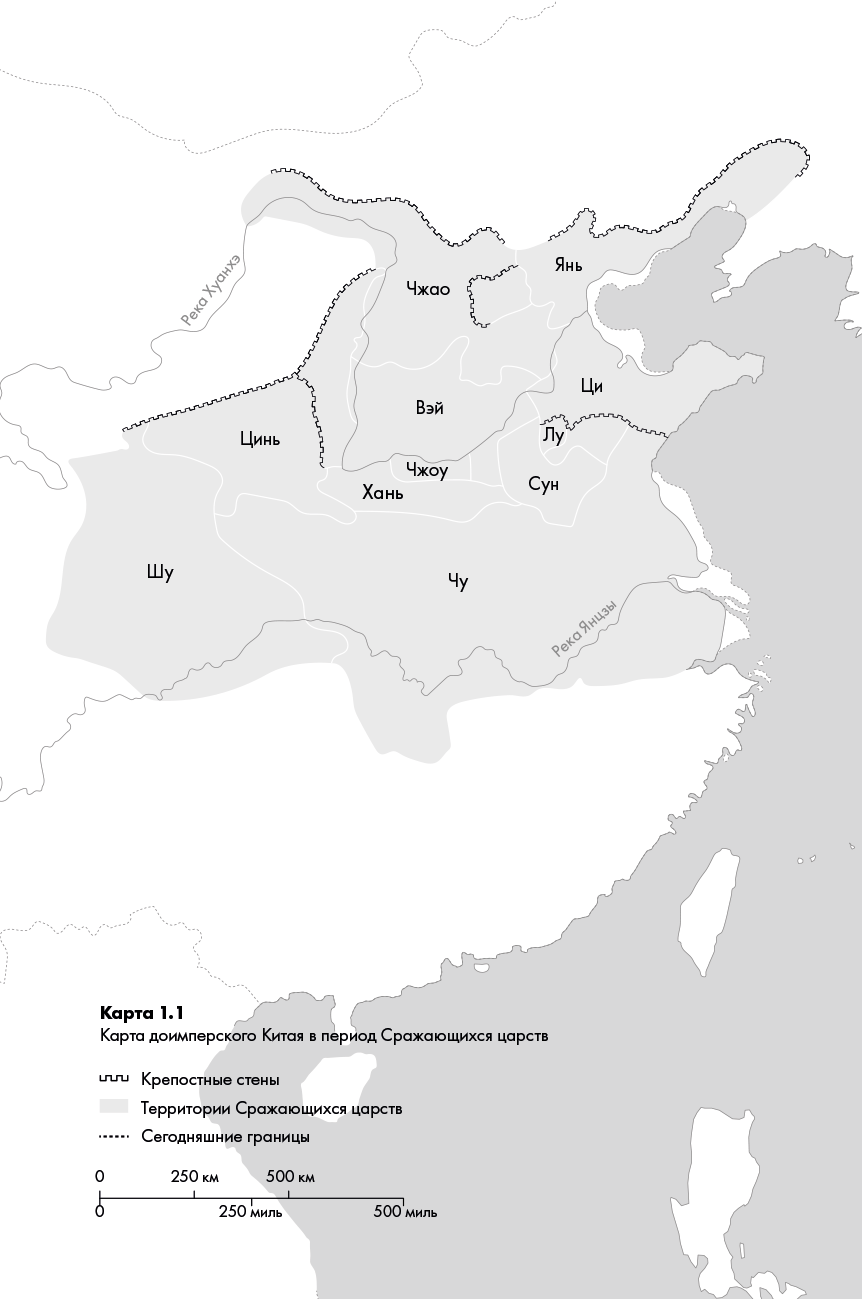 Впрочем, чжоуская версия идеи «все люди братья» просуществовала недолго. Понемногу власть правителей Чжоу становилась все более номинальной. По мере того как они утрачивали контроль над местными князьями, территория Чжоу распадалась на мозаичное пространство из сотен отдельных земель и миниатюрных государств. Около пяти веков эти конкурировавшие территориальные образования и их профессиональные армии были вовлечены в непрекращающуюся и запутанную череду соперничеств, захватов, битв, договоров и союзов. Таким образом, два с половиной столетия (481221 гг. до н. э.), когда семь ведущих государств Янь, Ци, Вэй, Чжао, Хань, Цинь и Чу с особенным ожесточением боролись за доминирование, с полным основанием стали называться периодом Сражающихся царств.