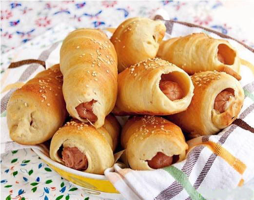 сосиски 50 г, мука пшеничная 1 сорта 75 г, вода 50 г, масло растительное 5 г, дрожжи 0,5 г, яйцо 0,5 шт., соль, специи.