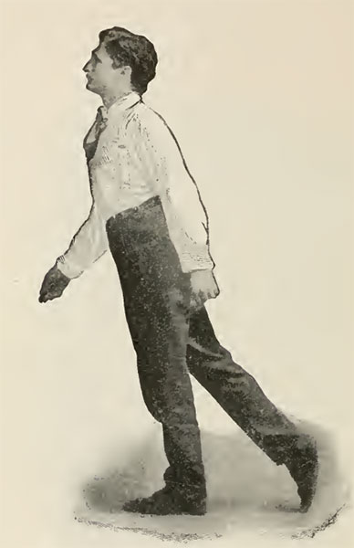 При принятии правильной позы пешеход наклоняет свое тело сильно вперед. Ведь ходьба должна быть непрерывным падением вперед, как и бег. Каждый шаг должен уберечь вас от падения, а тело всегда должно быть наклонено достаточно далеко вперед, чтобы обеспечить непрерывность движения. Вся поза всегда должна быть прямой, плечи отведены назад, грудь выдается вперед, голова откинута назад, глаза смотрят прямо перед собой, если только нет необходимости смотреть на землю, чтобы выбрать путь. Многие считают, что поскольку при ходьбе рекомендуется прямое положение тела, то необходимо отклонить тело далеко назад. Это серьезная ошибка.