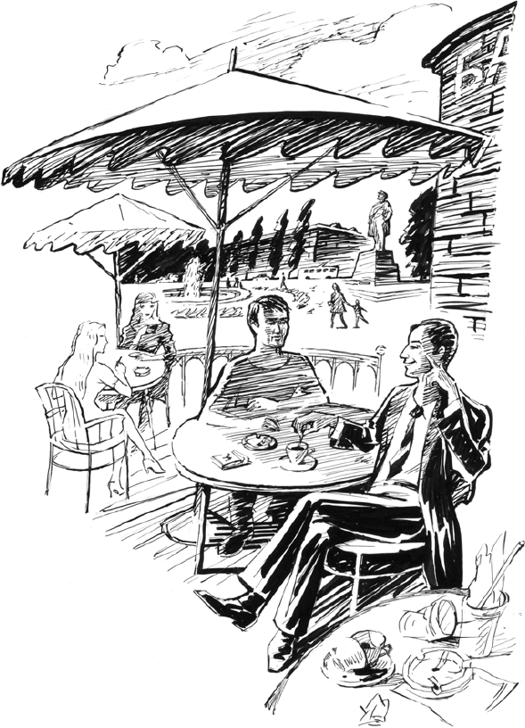 Две юные и яркие, как луговые бабочки, особы скучают за крайним столиком. Они вяло курят, лениво ворошат кофейную гущу в опустевших своих чашках, время от времени одна из них отпускает реплики по поводу соседствующей компании.