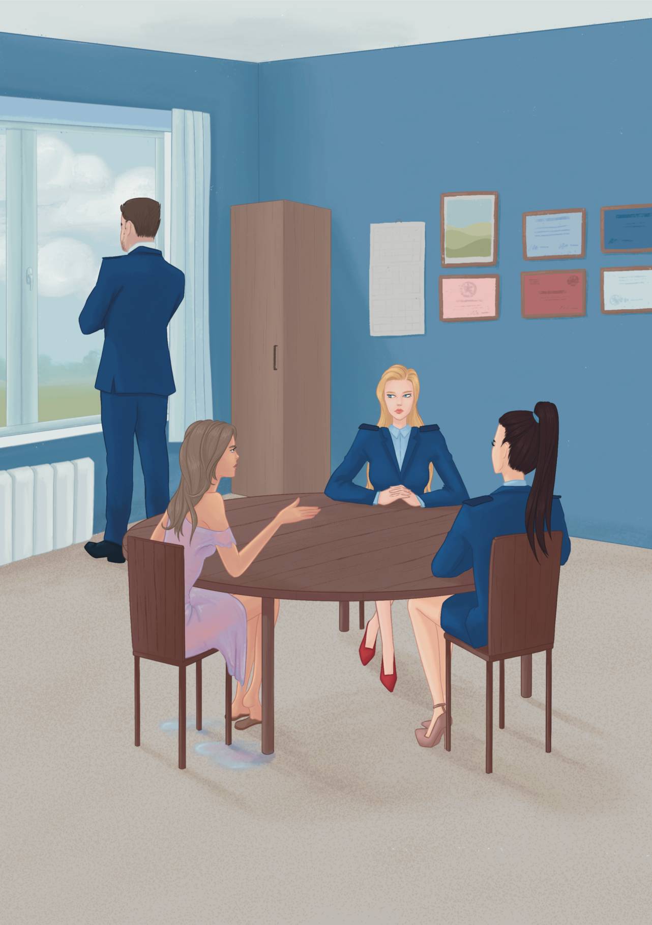 Инна сидела спиной ко входу за круглым столом. Её темные волосы были собраны в хвост. Около окна стоял участковый, высокий деревенский малец.