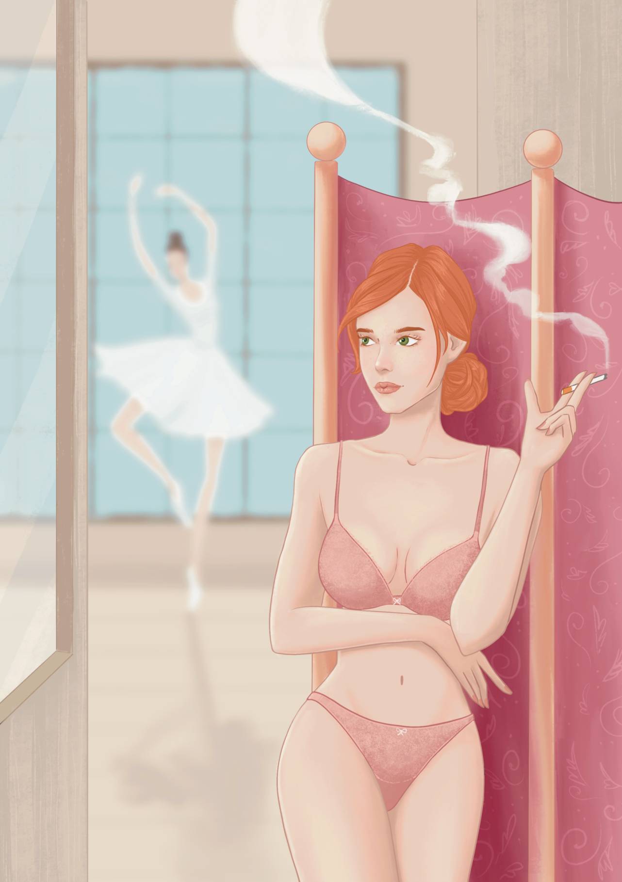 Красивая! Зелёные глаза. Смотрит куда-то вбок. Видно увидела кого-то. Кого-то, кого знает. Но почему она в коридоре в нижнем белье? Чтобы платье не пропахло дымом? Значит, коридор был не сильно проходным, и она никого не ждала. Кстати, бельё не в цвет платью.