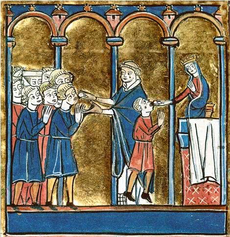 Рис. 6. Священник причащает христианских детей, а статуя Девы Марии, «ожив», еврейского мальчика, который вместе с ними вошел в церковь.