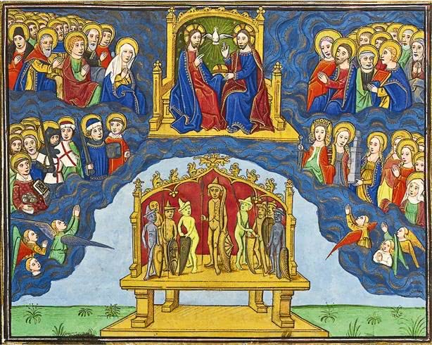 Рис. 7. На этой миниатюре, украшающей «Золотую легенду» сборник житий святых, который был необычайно популярен в позднее Средневековье, христинский «пантеон» противопоставлен языческому, истинная вера ложной. На небесном престоле восседает Троица, а вокруг выстроились сонмы святых. На земле стоит стол-алтарь, на котором собрались девять идолов. Христианский Господь, единый в трех ипостасях, и святые изображены как живые, в красках, языческие боги больше похожи на статуи. Их тела монохромны. Это лишь истуканы, созданные руками человека.