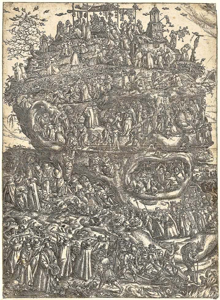 Рис. 8. Вскоре после иконоборческого восстания, вспыхнувшего в Испанских Нидерландах в 1566 г., Маркус Герардс Старший, который был убежденным кальвинистом, создал сатирическое изображение католической церкви, ее иерархии и семи таинств. Он показал «разлагающуюся» голову монаха, на которой, словно на огромной горе, копошатся десятки клириков. На макушке под балдахином восседает папа римский, окруженный грамотами индульгенций, кардинальскими шапками и епископскими митрами. Это источник его богатства вокруг монахи несут ему мешки со звонкой монетой. Во рту чудовища священник служит мессу, а в ухе слушает исповедь. В одной глазнице епископ рукополагает священника, а в другой священник сочетает мужчину и женщину браком.