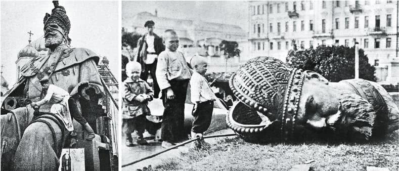 Рис. 15, 16. В июле 1918 г. в Москве был снесен памятник императору Александру III, открытый в 1912 г. рядом с храмом Христа Спасителя. С государя «сняли» мантию. Затем ему отбили голову с короной и руки со скипетром и державой. На пустом постаменте установили картуш работы Веры Мухиной с надписью: «Здесь будет сооружен памятник "Освобожденный труд"». Однако это намерение так и не осуществилось, а постамент, оставшийся от монумента, уничтожили в 1931 г. вместе с храмом