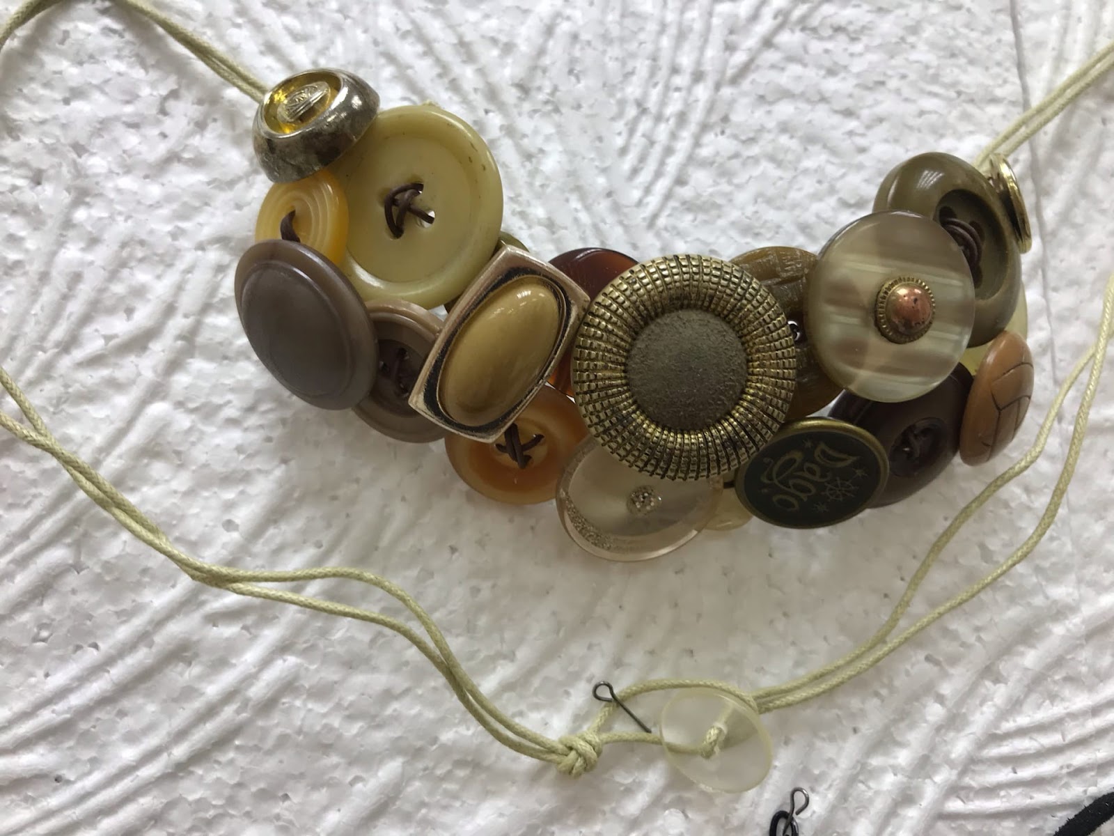 Когда я пересобирала колье из-за слабой натяжки, меня уже не устраивало, как подходят друг другу соседствующие пуговицы "Сейчас уже так не сопоставила бы их". Поначалу пыталась целиком повторить прежний набранный рисунок, порядок по цвету, по форме. Но позже я сдавалась: сочиняла колье заново из прежней горсти пуговиц, добавляя 5-6 в том же стиле и тоне, оставляя несколько из первого варианта. Как при разборке и сборке часов у начинающих мастеров остаются лишние детали.