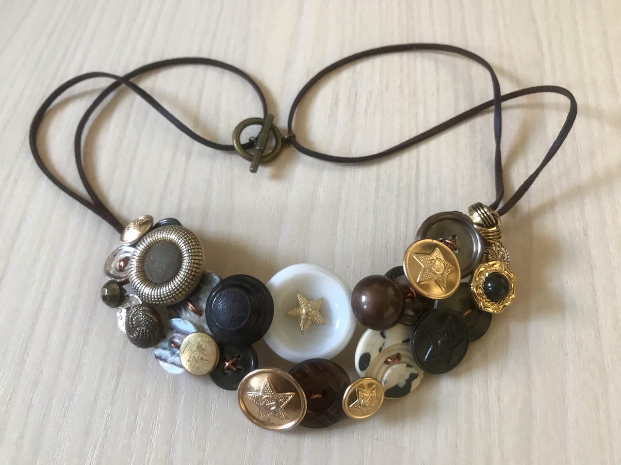 Давняя знакомая, коллега из партнерской организации, увидела в соцсети фотографию колье, попросила то, которое называлось у меня «Ореховое» да-да, я всем своим творениям еще и названия придумала. У этого были бежевые пуговицы с коричнево-бронзовыми окантовками, как ядра орехов в раскрытой скорлупе. А в центре винтажная непарная запонка с опаловой вставкой.