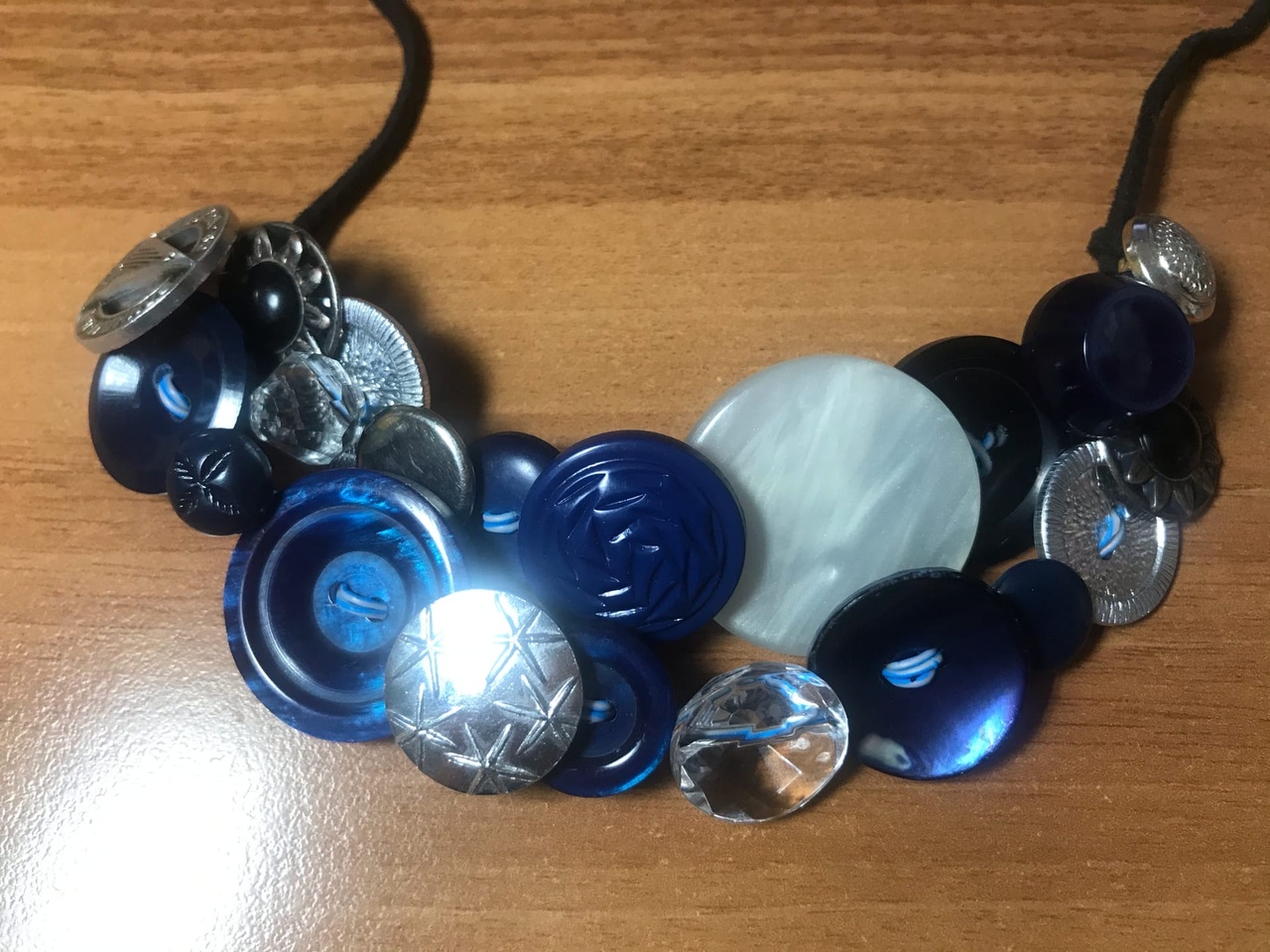 Моя 80-летняя мама похвалилась своей 78-летней подруге Галине Петровне, какие красивые колье из пуговиц я делаю. И та насобирала мне передачку: в изящную баночку из-под крема для лица были насыпаны горсти две пуговиц, да каких! Она тоже, как и моя свекровь, раньше шила, а жила в Риге. Пуговицы от нее были немного другими декоративнее, элегантнее. Особенно понравилась дымчато-серая, как сумеречное небо с облаками, и на этом пластике сверху в центре витиеватый кружевной металлический ромбик, как серебряный. Был у меня в наличии металлический месяц с дорогой сумочки, так я ту пуговицу рядом с тем месяцем приспособила: вроде как он на фоне предрассветного неба с крупной звездой поблизости.