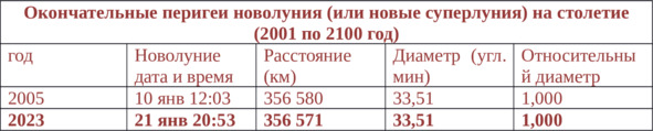 За столетие в отдельную группу выделяются новые суперлуния, в которых расстояние новолуния меньше или равно 356 900 км. К таким относится только первое из приведенных (21.01.2023).