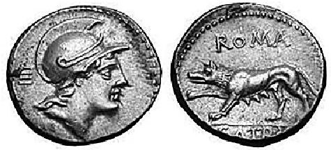 Богиня-персонификация Рима Рома и Капитолийская волчица на римской монете