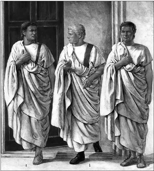 Римские «всадник» (слева), сенатор (в центре) и народный трибун (справа)