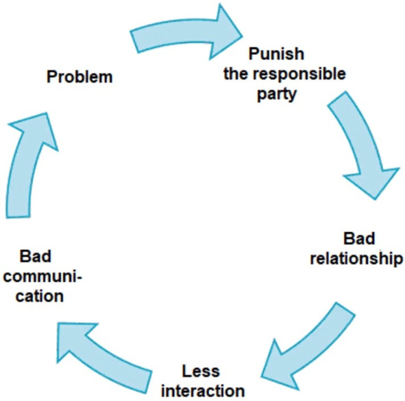 But when nobody solves the problem, it begins to grow, and ultimately ends up becoming so enormous that the big boss at the top of the food chain can see it. Of course, any manager in such a situation has one universal solution: delegate the responsibility to someone. However, regardless of which of these divisions has its representative chosen as the responsible party, they will think that they were unfairly punished in favor of their colleagues from the other department (s). As a result, relationships between employees of these divisions grow worse; they begin to communicate less frequently, and the situation only continues to spin out of control. A vicious cycle is created, which I have drawn out in the diagram below.