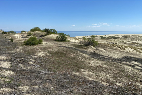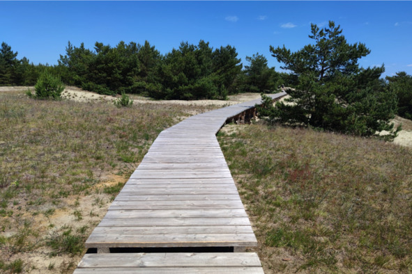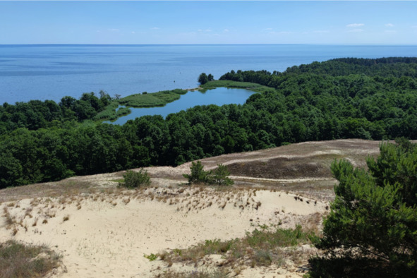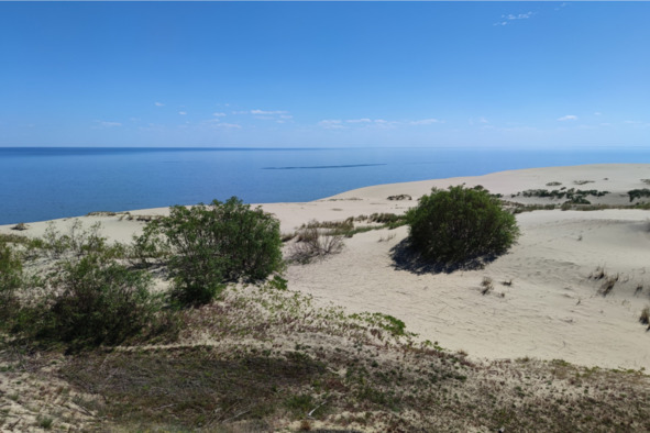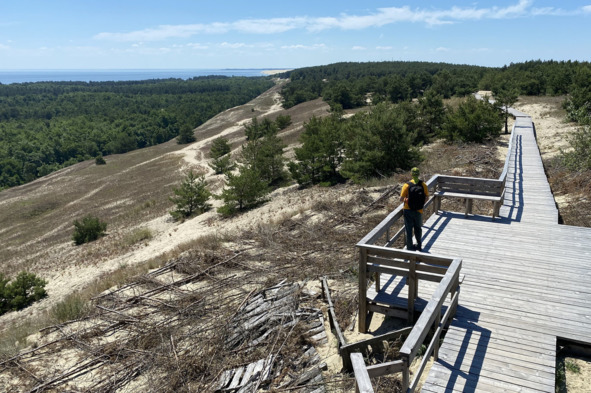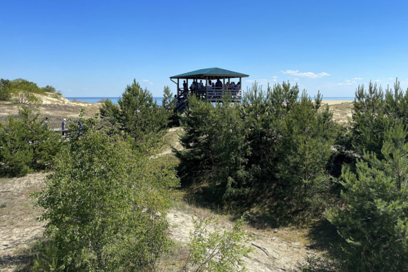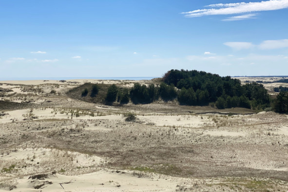 Тем не менее смотровая площадка озера Лебедь это самый удаленный маршрут национального парка, который находится в каких-то четырех километрах от литовской границы, а потому экскурсионные группы туда не возят. А зря, лучше и интереснее места на Куршской косе, на наш взгляд, в наши дни не сыскать. Маршрут начинается с соснового бора, высаженного, как утверждают, в начале XX века. Деревянные настилы, плавно устремляясь вдоль просеки вверх по обнаженному песчаному склону дюны Оленья, выводят на гребень, где резко уходят влево, образуя пятиметровый «провал» (видимо, досок не хватило), заставляющий путника, поправ все правила, ступить на землю обетованную. Оттуда до смотровой площадки уже рукой подать, но и без нее эмоции зашкаливают: волнообразные всполохи песчаного наста, островки сухостоя и молодой поросли, зеленый ковер леса, зеркальная гладь озера да нежная рябь Куршского залива. А наградой для самых смелых, добравшихся до вышки, станут еще бескрайние пески странствующей дюны Красная, которая, по мнению ученых, ежегодно сдвигает свое тело на два метра.