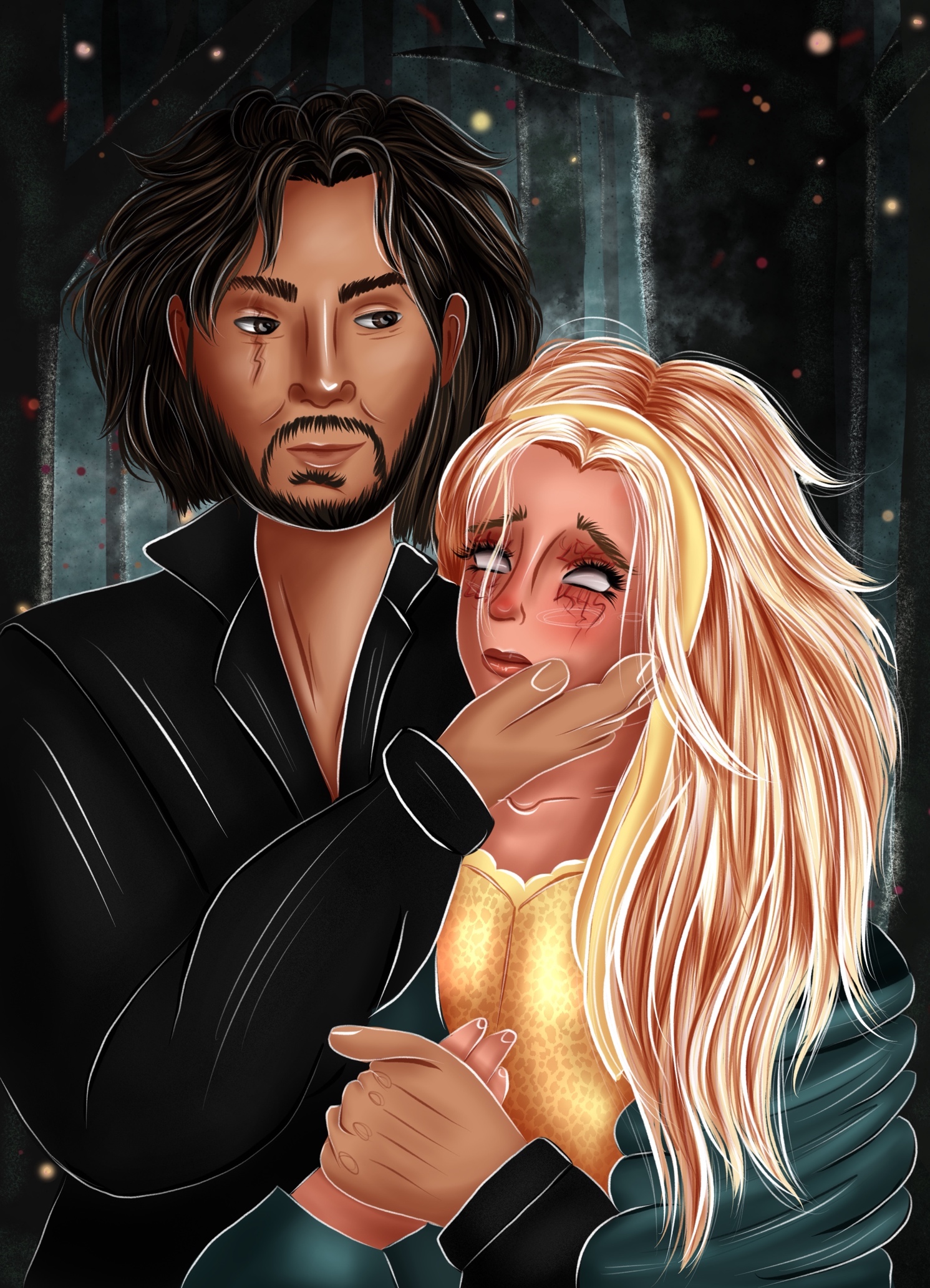Едва держась на ногах, Аврора пытается бежать, но спотыкается о корягу, уже летит на землю, но вновь оказывается в его объятиях. Обессиленная, она лишь прижимается к груди.
