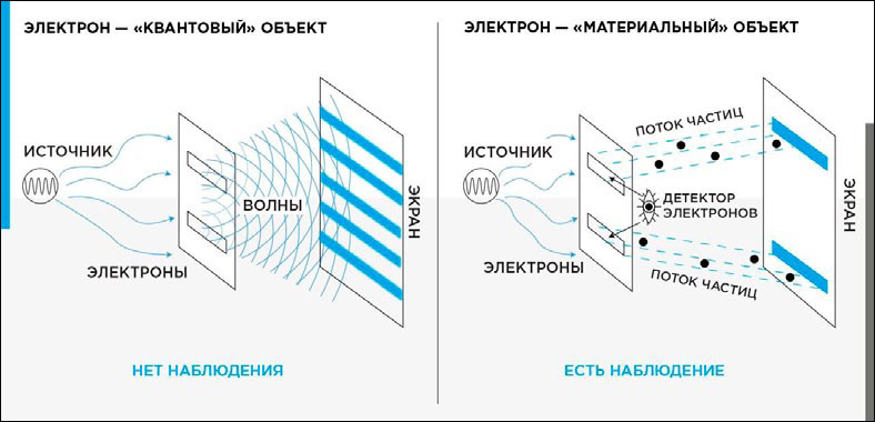 Если есть наблюдатель электрон «материализуется» как частица, и проходит через одну конкретную щель.