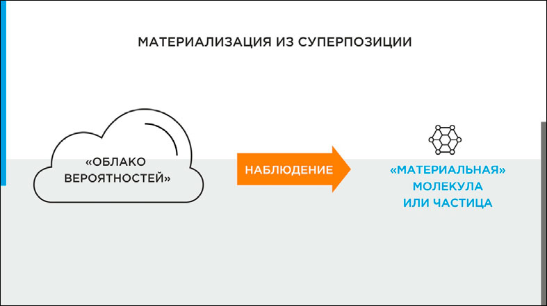 Прежде всего: все элементарные частицы, из которых состоит «материальный» мир, изначально, до наблюдения за ними, находятся в так называемом состоянии «суперпозиции».