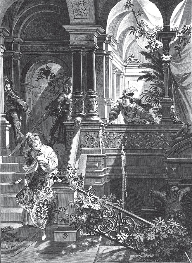 Посмотрел королевич невесте на ногу и увидал, как кровь текла из башмачка и покраснел от нее белый чулочек. Повернул он своего коня обратно и привез эту невесту к родителям в дом. «Эта тоже ненастоящая! сказал он. Нет ли у вас еще одной дочки?» «Нет, сказал отец. А вот только еще от моей первой, покойной жены осталась этакая маленькая, дрянненькая Замарашечка, уж та-то, конечно, тебе не невеста». Королевич захотел ее непременно видеть; но мачеха отвечала: «Да нет же, она такая грязная, что ее никак и показать не смеем». А королевич все настаивал на своем, и должны были наконец позвать к нему Замарашку. Та сначала вымыла чистенько лицо и руки, потом вышла и поклонилась королевичу, который подал ей золотой башмачок. Она тут же присела на скамеечку, скинула свой деревянный башмак и сунула ногу в туфельку, которая по ее ноге пришлась как влитая, и как она поднялась со скамеечки и королевич глянул ей в лицо, то он тотчас узнал в ней ту красотку, с которой танцевал, и воскликнул: «Вот она, настоящая-то невеста!» Мачеха и обе названые сестры перепугались и побелели от досады; а королевич взял Замарашку к себе на коня и повез ее в свой замок. Когда они проезжали мимо орешины, два белых голубка ворковали: