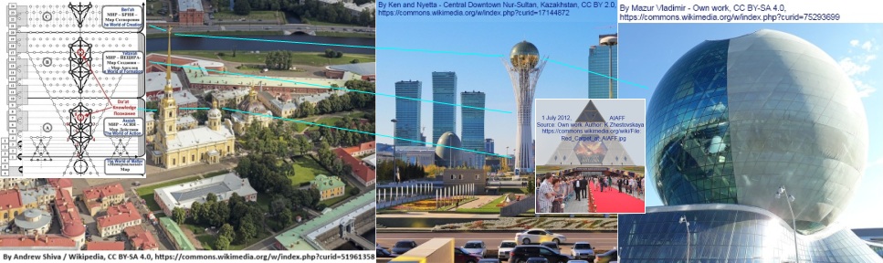 Если Петропавловская крепость имеет отношение к серебряному варианту и созданию новой земли для перерождения, то сфера «Нұр Әлем (Nur Alem)» соответствует верхнему миру нового золотого Древа Жизни, символ которого появился в Казахстане в 1997 году в виде Монумента Байтерек.