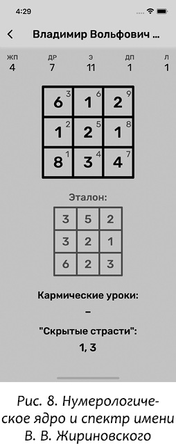 А вот другой пример: Владимир Вольфович Жириновский. Родился 25 апреля 1946 года (рис. 8). Надо заметить, что это имя не является полным официальным, до совершеннолетия Владимир Вольфович носил фамилию Эйдельштейн. Распространенная и всем известная версия имени это фактически малое имя, но очень важное, и именно его мы будем анализировать.
