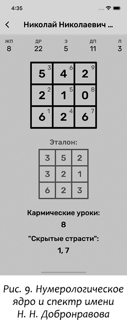 Еще один пример: Николай Николаевич Добронравов, родился 22 ноября 1928 года (рис. 9). В спектре его имени Единица и Семерка одинаково сильны. Какому из этих чисел мы отдадим предпочтение? Я думаю, вы согласитесь, что Семерка важнее, ведь она встречается реже, чем Единица. При этом она не имеет выхода в нумерологическое ядро. Тройка тоже выражена неплохо и является Числом Личности. Неудивительно, мы имеем дело с поэтом. А как в судьбе Добронравова проявляет себя Семерка? Я не знаю. Я прочел его краткую биографию в «Википедии» и не получил ни малейшего намека на Семерку, кроме, пожалуй, того, что он вырос во время войны в детском доме. Мне кажется, это хороший пример того, как сильно выраженное в нумерологическом спектре число может на самом деле быть совершенно не очевидным при поверхностном взгляде на человека.