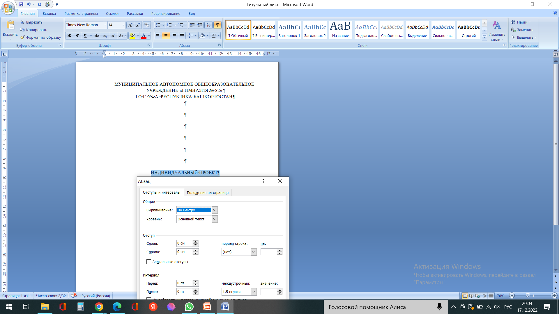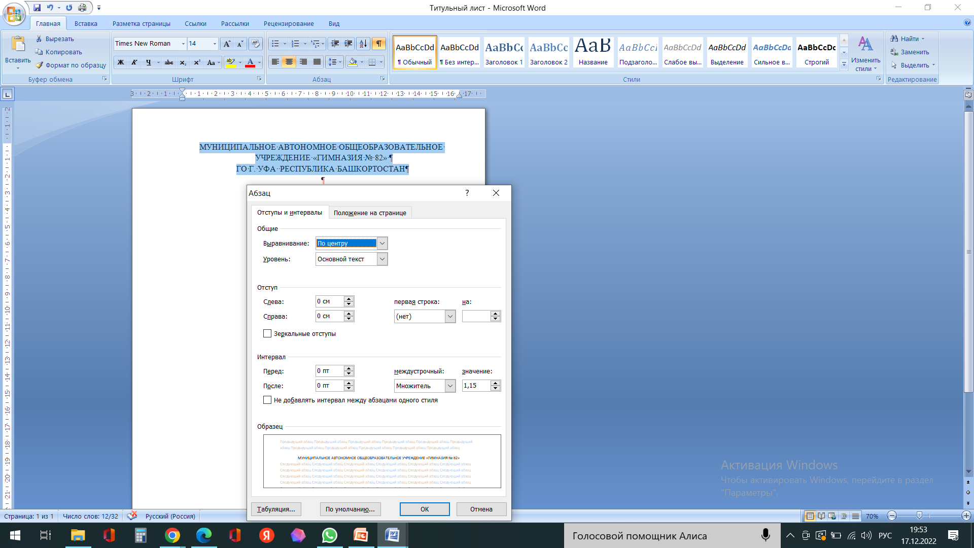 Для начала необходимо напечатать: МУНИЦИПАЛЬНОЕ АВТОНОМНОЕ ОБЩЕОБРАЗОВАТЕЛЬНОЕ УЧРЕЖДЕНИЕ «ГИМНАЗИЯ 82» ГО Г. УФА РЕСПУБЛИКА БАШКОРТОСТАН