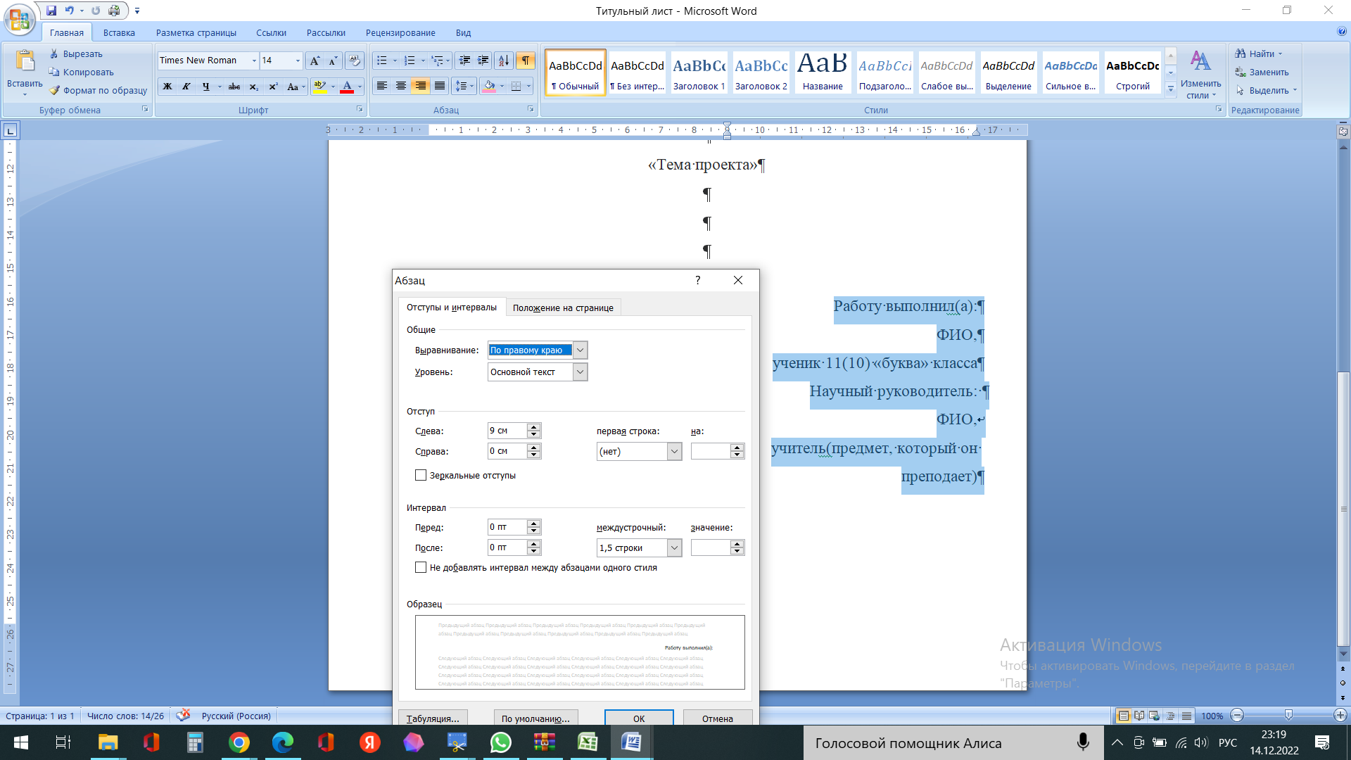 Следующей частью является блок с данными ученика и научного преподавателя. После темы работы необходимо пропустить 4 пустые строки.