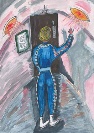 Жюль решила сначала сходить за скафандром для Гуппи. Повернув налево от душевой, вдруг увидела Кельвина. Она очень удивилась, что он так быстро вернулся от командира, хотела подойти к нему, чтобы напомнить, что его ждёт Гуппи. Но что-то удержало её, она остановилась, наблюдая за товарищем. Он, не замечал Жюль. Его лицо было сосредоточенно, будто бы он вслушивался в чью-то речь. Внимание подруги привлекла светящаяся точка, которая пробежала по руке Кельвина и тут же пропала. Через некоторое время точка появилась снова, тут же следом за ней, по костюму астронавта, пробежало множество таких же точек и исчезло. Девушка сразу вспомнила планету Драконов и роботов-надсмотрщиков. Там были тоже такое явление, только с лампочками. Тогда её друг пояснил ей его назначение: Свечение точек означает передачу информации.