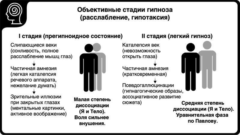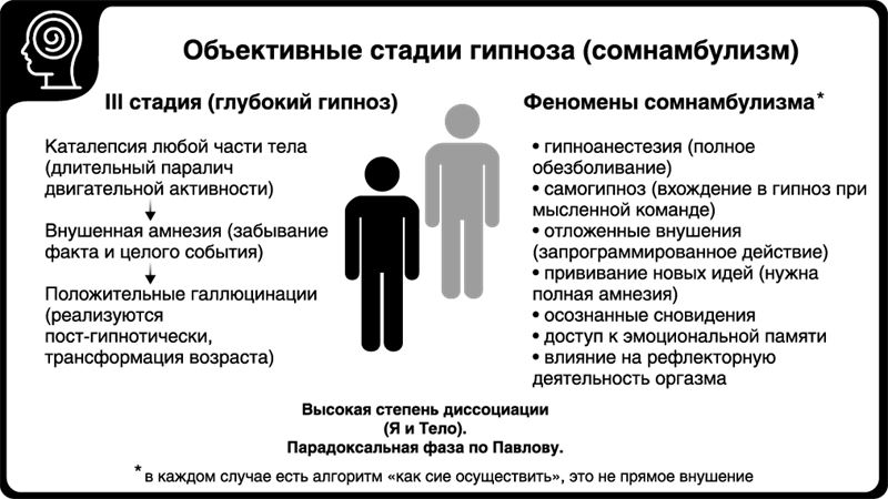 Отдавая дань традиции, можно выделить три стадии гипноза (см. Схема 1 и 2). Принципиальный момент в том, что в науке гипноз следует отчитывать с амнезии (сомнамбулическая стадия), иначе процесс гипнотизации становится больше похож на подыгрывание. Можно удивлять и при условии «как если бы гипноз есть», хотя профессиональнее следует уметь скрыто отбирать сомнамбул и строить представление по законам иллюзорного жанра.