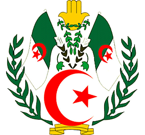 В 1963 г., после того, как Национальное учредительное собрание провозгласило создание Алжирской Народной Демократической Республики, был принят новый герб. На нем было изображение красного полумесяца и звезды, над которыми три золотые колоса, растущие из одного корня; над колосьями золотая «ладонь Фатимы», обрамленная снизу двумя зелеными ветвями; в основании колосьев перекрещивались древки двух национальных флагов, которые обрамляли «ладонь Фатимы» и полумесяц со звездой; обрамляли герб зеленые оливковая (слева) и пальмовая ветви, перевитые внизу зелено-белой (горизонтально) лентой.