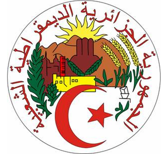 Пальмовые ветви и три колоса символизируют сельское хозяйство и его значение для развития Алжира; фабричные сооружения и буровая нефтяная вышка символы развивающейся индустрии; горы географическую особенность страны и то, что большая часть населения Алжира проживает в пределах Атласских гор; восходящее солнце обновление и наступление счастья для страны и для народа.