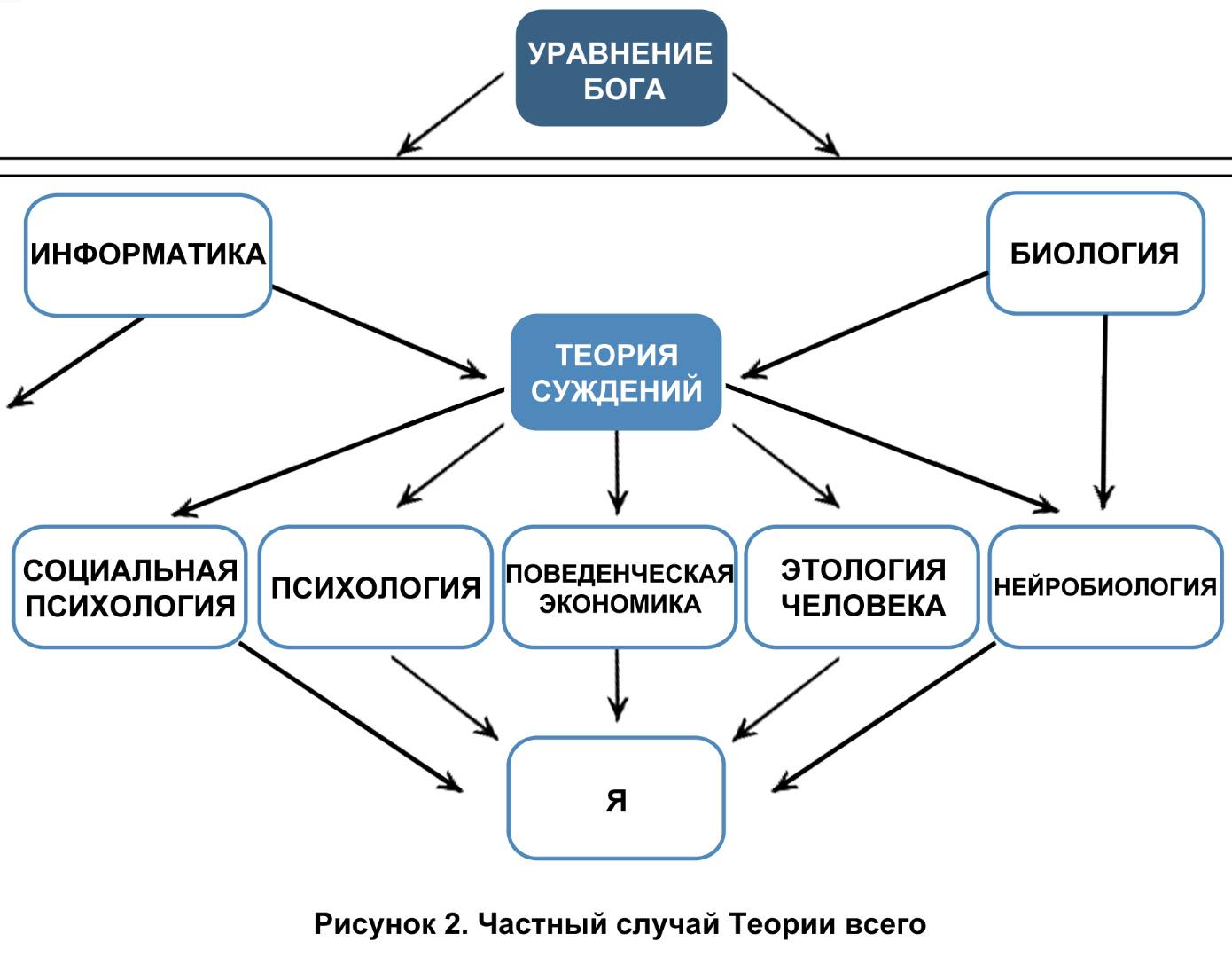 Мы должны понимать суть центральной идеи книги, своё местоположение. Также стоит оговориться, что Теория всего это лишь концепция. Каждый, кто о ней пишет, добавляет что-то своё. Главное правило любой интерпретации «Теории всего», что схема должна идти от общих принципов к частным. К примеру, «Теорию Суждений» в других интерпретациях найти не получится, но вы не сможете её вычеркнуть после прочтения этой книги. Также в этой книге добавлен элемент «Я», обычно его нет. Я свёл науки, касающиеся лично вас, в одну точку. Физическая Вселенная не замыкается на «Я», в мире еще много чего интересного, лично на вас замыкается всего пара научных дисциплин.