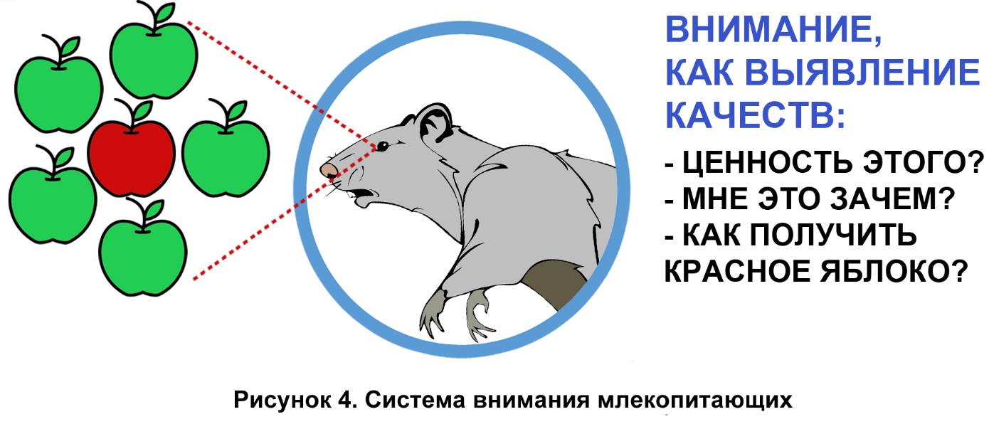 Млекопитающие начали создавать интеллектуальные объекты (разной сложности) на своей внутренней сцене. Это еще нельзя назвать сознанием, но они уже научились приспосабливаться, лучше охотиться и учиться на своих ошибках. И да, стоит сказать, что любое млекопитающее эгоцентричное существо и им движут только инстинкты (рисунок 4).