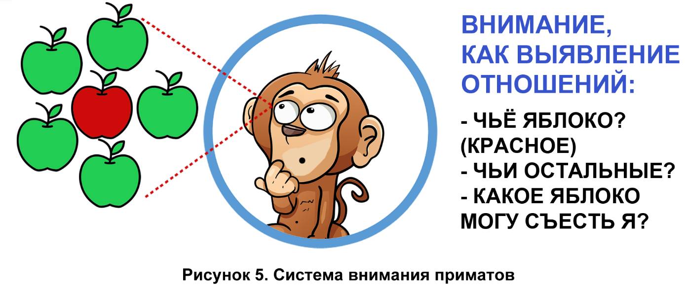 Мироощущение нас, как примата, построено на модели самого себя относительно группы. Любой примат способен и ощущает себя отдельным субъектом32 33. Вот и получается, что самосознание является обычным следствием системы внимания примата. Мы эту тему еще продолжим в следующей части главы (когда будем говорить уже о Homo Sapiens).
