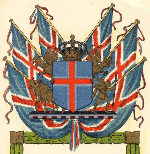 В 1918 г. Исландия была провозглашена суверенным государством в унии с Данией и вскоре ее герб был изменен. За его основу был принят исландский флаг красный крест с серебряной каймой в синем поле.