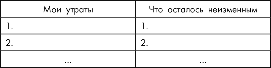 Разделите лист бумаги на две колонки. Одна колонка будет называться: МОИ УТРАТЫ, вторая ЧТО ОСТАЛОСЬ НЕИЗМЕННЫМ. В колонку с утратами вы пишете списком то, что действительно потеряли из-за кризиса. Например, работу, клиентов, возможность путешествовать, иметь помощницу по дому, общение с друзьями, отношения с мужем и т. д. Что-то очень конкретное и измеримое. Только не пишите: ВСЕ УТРАТИЛ/А. Пока мы живы, это не так.