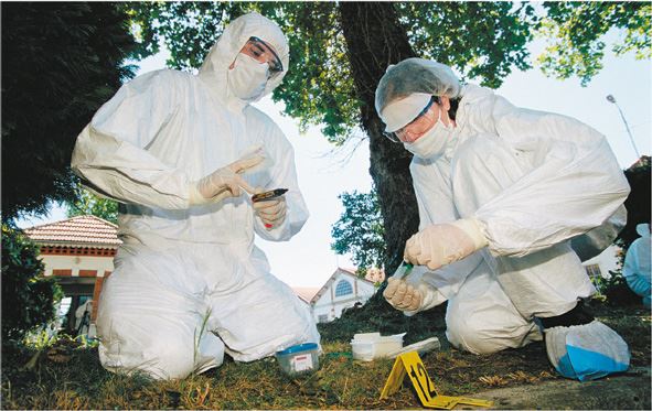 Криминалисты работают на месте преступления, маркируя и собирая улики. Они носят защитные костюмы, чтобы избежать загрязнения места преступления