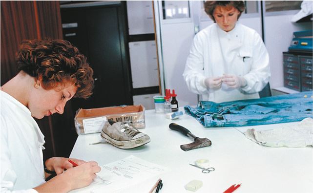 Эксперты-криминалисты осматривают кроссовки и джинсы вероятного подозреваемого. Они ищут и исследуют улики, подробно фиксируя свои находки