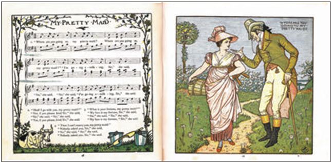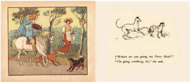 Интересно сравнить, насколько по-разному три художника иллюстрируют одно и то же стихотворение. Вот, например, стихотворение «Молочница». У Гринуэй история о деревенской девушке и её незадачливом ухажёре уместилась (пусть и лишь один куплет) в одном рисунке, у Крейна (вместе с нотами) заняла разворот. А Кальдекотту, чтобы рассказать об этом неудачном сватовстве, понадобилось двадцать четыре рисунка, из которых шесть полноцветные иллюстрации! Художник не только подробно изобразил забавное ухаживание глупого щёголя на глазах у всей деревни, жители которой, конечно, тоже стали персонажами поставленного Кальдекоттом «спектакля», но и дополнил историю параллельным сюжетом знакомством двух собак, принадлежащих главным героям, которое, увы, также закончилось ничем.