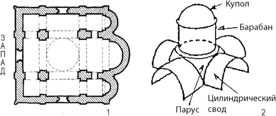 Вход расположен традиционно с западной стороны. Сооружение имеет квадратный план (ил. 7.1). Четыре столба, мощных, крещатых (к каждой стороне приставлена лопатка), намечают в плане равноконечный (греческий) крест. Рукава креста ориентированы по сторонам света и перекрыты цилиндрическими сводами (ил. 7.2). В результате в пространстве интерьера реально представлен сакральный в христианстве образ креста. С восточной стороны примыкает трехапсидный алтарь. Центральную часть храма, т. е. средокрестие, перекрывает купол, установленный на круглом барабане (ил. 7.2), прорезанном немногими окнами (на чертеже не показаны). Переход от круглого барабана к опорам-столбам осуществляется при помощи треугольных парусов (ил. 7.2). С северной, западной и южной сторон во втором ярусе располагается галерея, получившая название «хоры».