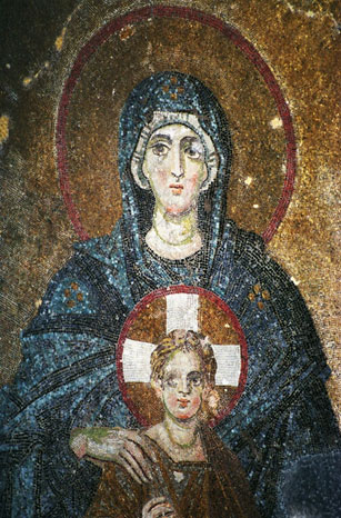 Мозаики. Другая характерная особенность декорации византийских храмов щедрое украшение стен и сводов изображениями, выполненными в технике мозаики. Сам по себе этот прием был хорошо известен и широко практиковался в Древнем Риме, но в византийских храмах именно мозаичная декорация часто становится определяющей. К тому же византийские мастера внесли в это искусство свои профессиональные новации, добившись новых исключительных художественных эффектов. Во-первых, византийские мозаики выполнялись преимущественно из смальты окрашенных цветными эмалями кусочков стекла, которые красочно сияли. И, во-вторых, их укладывали под небольшим углом друг к другу, так что они по-разному отражали свет, благодаря этому возникали тончайшие художественные нюансы. В мозаиках изображали Христа, Богоматерь (см. ил. 6), святых и мучеников; в них представали в сопровождении свиты императоры (ил. 10) и императрицы (см. ил. 25.1); мозаичные фигуры императоров были обнаружены под поздним живописным слоем в Софии Константинопольской. Нередко мозаики носили чисто декоративный характер (кресты, орнаменты).