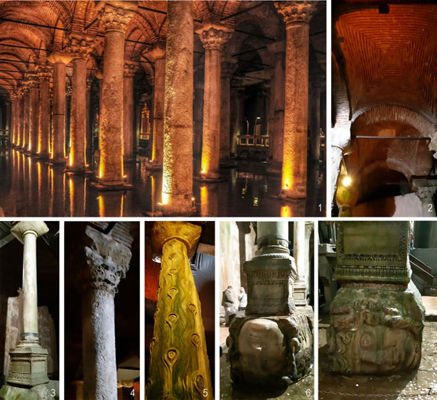 1. Общий вид. 2. Сомкнутые своды потолка. 35. Варианты колонн. 67. В основании колонн голова Медузы Горгоны