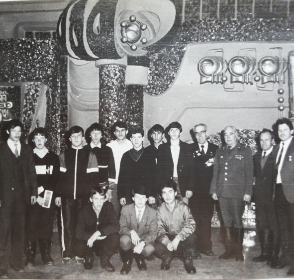 В фойе д/к«Комсомолецмолодёжь на встрече с ветеранами П. М. Вевчеренковым, С. С. Шабельяновым, А. Д. Сакериным.
