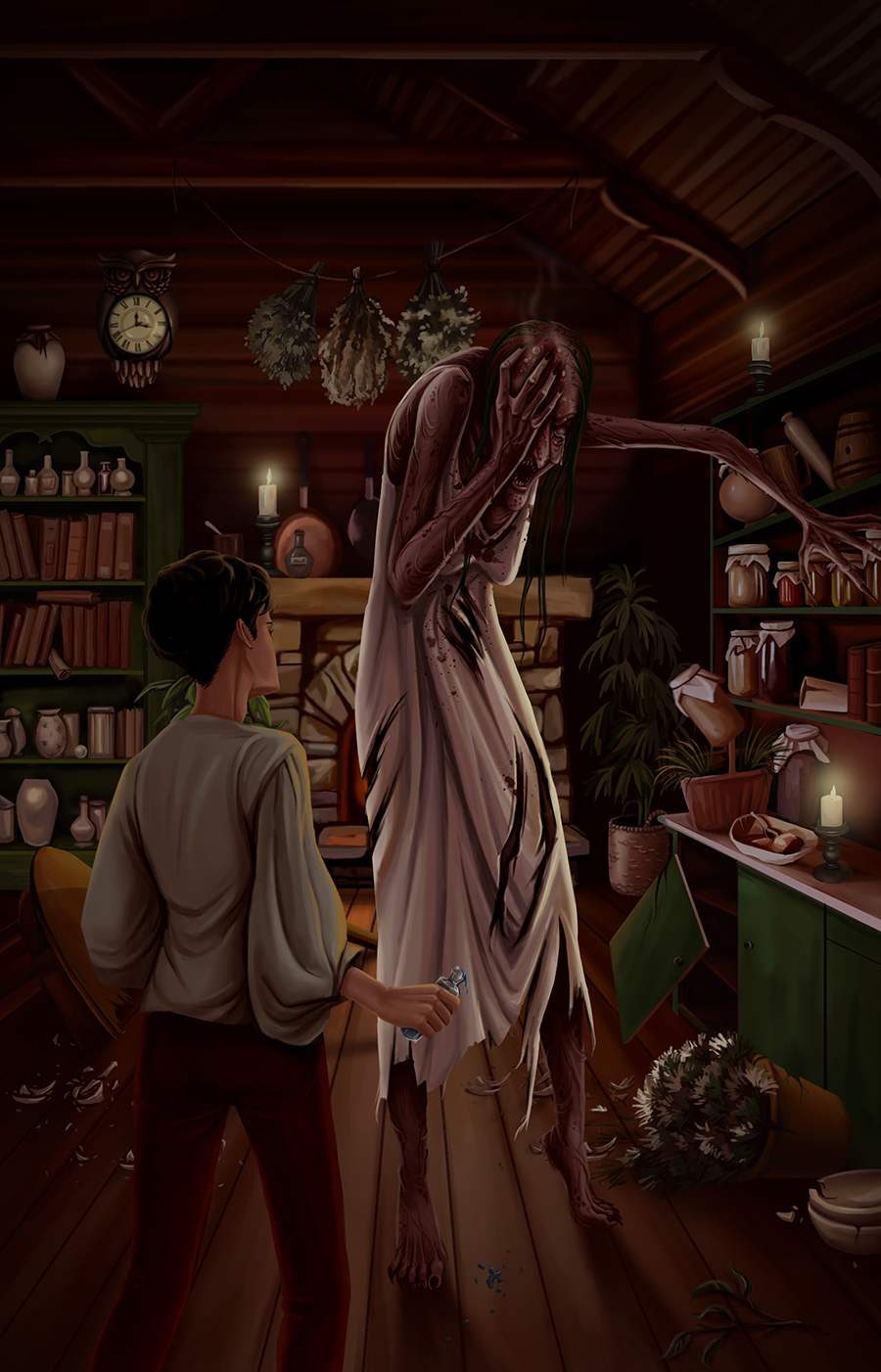 Деревянная сова продолжала отбивать часы в такт секундам, а восковые свечи все стремительнее оплавлялись, оставляя лишь серовато-меловую дымку, аромат душистого ладана и угольный обнаженный фитиль. В комнате витал морозный ветерок поздней осени, залезая под слои испачканной одежды и отрезвляя сонные головы. Фрукты на столе притягивали взгляд своими сочными спелыми бочками, даже сытость округлившегося живота не позволяла не думать о них. Но в одну секунду все резко изменилось. Бран всем своим существом ощутил вязкое чувство страха, плавно растекающееся по телу словно мед с веретена от макушки и дальше по спине. Вмиг он увидел остекленевшие глаза Нисы, услышал хриплый выкрик Арин и ощутил отвратительно-навязчивый звон в ушах. Словно зазвучала чарующая музыка приближающейся неизбежной трагедии. В мгновение его тело стало таким легким и ватным, что приятно онемевшие ноги уже не могли удержать его на месте. Юноша как бы со стороны наблюдал за происходящим безумием. Из окутанной мраком комнаты вышло нечто ужасное существо, которое сложно было описать словами. Его острые когти и взгляд сощурившихся лиловых глазниц с выпуклыми, словно паутина, алыми венами бешено метался по комнате от одного ребенка к другому. Заостренный подбородок был усыпан жирными волосатыми бородавками, словно лесная прогалина дикими ягодами, а с плешивой головы торчащими перьями, облепив огромный клыкастый рот и иссохшие костлявые щеки, свисали темно-зеленые пряди волос. Словно остервенелое животное, существо хваталось за окружающие предметы, метая их в незваных гостей, вгрызаясь в деревянные шкафчики и разрывая их, будто тонкий лист бумаги.