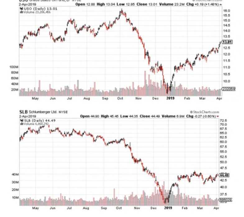 Просто посмотрите на график Oil ETF (USO) по сравнению с Schlumberger Ltd. (SLB).