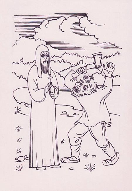 Ведомо тебе, матушка Бур-Ань, начал он, что в низовьях Эжвы[13] есть селение Котлас, и Пырасом его называют, а этот Котлас последнее наше селение вниз по Эжве. Далее наших селений нет. Так вот, мы и были в этом Котласе: я да Сед-Син, по своим делам ездили. Пристали мы к берегу у Котласа, а там уж суета стоит: все бегут на зеленую лужайку около селения и кричат: «Московский человек приехал! Новую веру вводит! Не оставим своих богов!» а сами рогатины да дреколье с собой на случай захватывают. Ну, побежали и мы за ними. Прибежали, смотрим: сидит на перевернутой лодке посреди лужайки не старый человек, одет в черную одежду, с длинными русыми волосами, с небольшой бородой, а лицо такое доброе, простое. В одной руке перпа[14] блестит, а другою на небо указывает и говорит о московской вере. Не посмели тронуть его котласские люди, сильно уж кротким он показался, руки не поднялись на него. А говорит он по-нашему, по-зырянски, все понимают его слова. Послушали, послушали его котласские люди, а он говорит, говорит Как вдруг и подступил к нему юр-морт Котласа да закричал: «Как ты смеешь смущать нас? Какое тебе дело до нашей веры? Ведь мы убьем тебя!» Топором на него замахнулся. Да не испугался этого московский человек, только посмотрел на него с укоризной да сказал: «Что я тебе худого сделал, что ты хочешь убить меня? Разве убивают человека за доброе слово? А я вам добрые слова говорю и желаю, чтоб спаслись вы в правой вере. Не обижать, не грабить я вас пришел, а выводить из тьмы к свету» И опустил топор юр-морт, и спросил уже со смирением: «А какой ты человек есть? И как тебя по имени зовут? И есть ли при тебе грамота княжеская? «А зовут меня Стефаном, отвечал московский человек, и иду я из града Москвы, а уроженец я устюжский. А грамота княжеская при мне» и показал он грамоту княжескую, что была за большой печатью. И отступил от него юр-морт, и снова начал Стефан о московской вере говорить. И все слушали его Обольстил он всех своим добрым видом да словами ласковыми: непривычно ведь, нам от московских людей добрые слова слышать. А он все добром да лаской. Вот и прельстились все