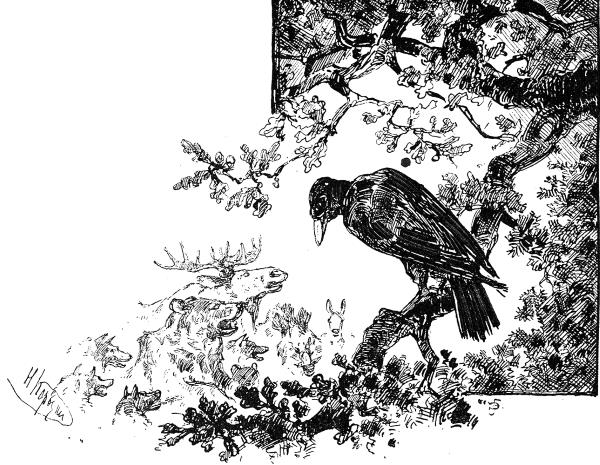 Слетел ворон, белый от старости, пониже, умостился на сухом суку, почистил нос и начал: