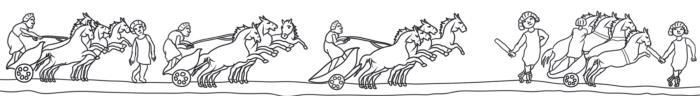 Рис. Ч5. Прорисовка барельефа южной стороны пьедестала Обелиска Феодосия (рис. Д. Т. Керимовой). Состязания колесниц на Ипподроме. На заднем план служители арены. В их руках, предположительно, те же таблички, что у работников на рис. 422