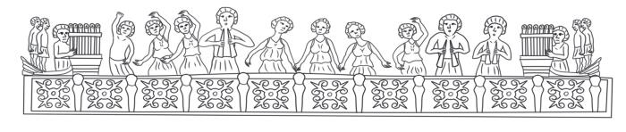 Рис. Ч6. Прорисовка фрагмента «Диптиха с цирковыми сценами». Перформансы акробатов и жонглеров на арене ипподрома (рис. Д. Т. Керимовой)